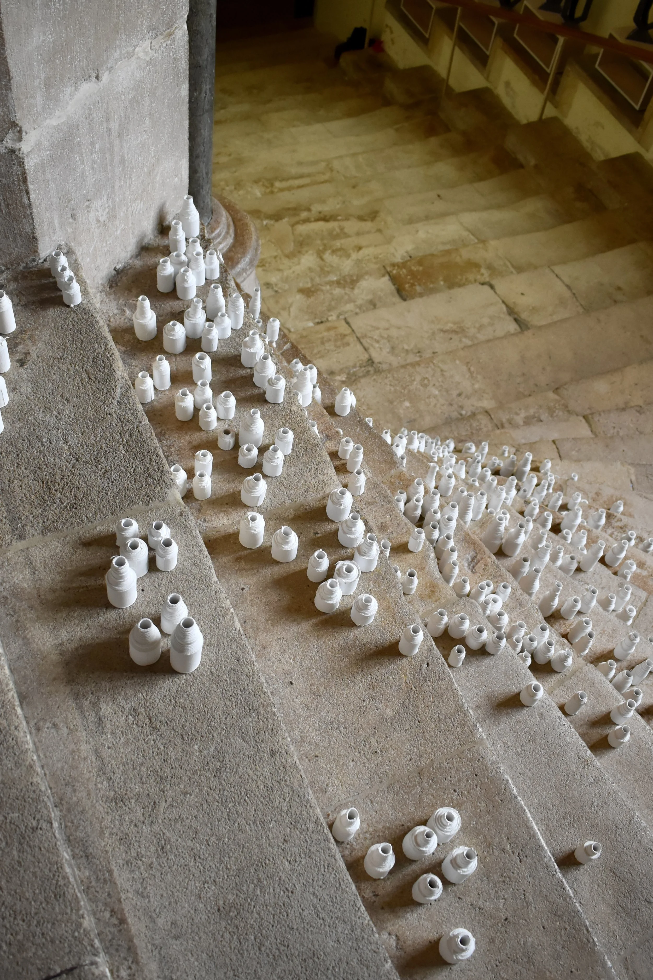 Making Sense #2 presents itself on the Chapter House steps, shifting the work further toward concepts of hierarchy. The repeated platforms of each step act as stage sets and address notions of an ascending and descending system of levels. Characters, chapters and narrative are integral to the final placement of the objects as pattern and rhythm create reason and make sense of the work. Each step is a supporting structure for the components of the work to unfold into.